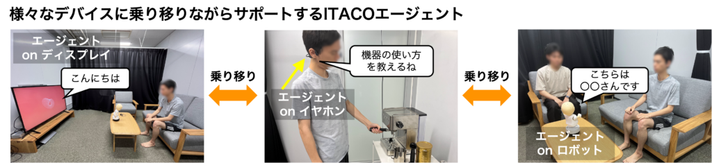 人をサポートするエージェントでは、音声対話のみで済むタスクや、家事など物理的身体が必要なタスクなど、状況によって求められる身体性が変化します。そこで、スマートフォン、ロボット、ウェアラブルデバイスなど、身の回りのあらゆるデバイスに乗り移り(憑依)しながら、ユーザの生活を切れ目なくサポートできるITACOエージェントを開発しています。システムの実装に加え、様々に身体を変えるエージェントを用いた実験を通じて、人とエージェントの信頼関係において身体性がどのような役割を果たすのかを明らかにすることを目指しています。