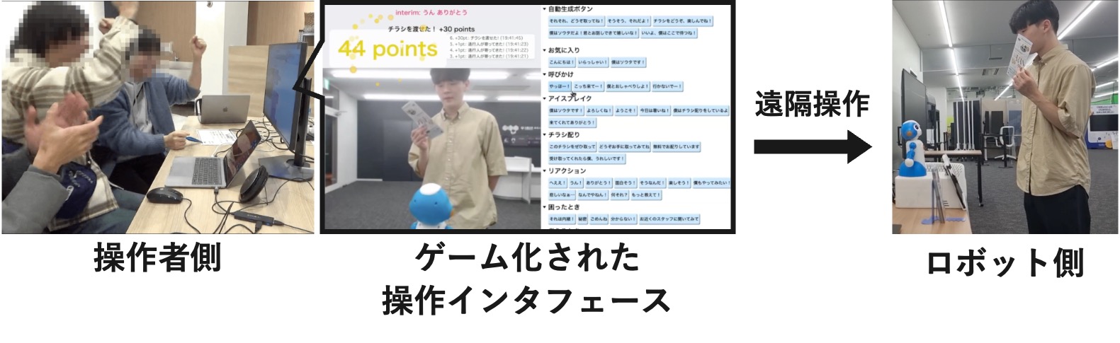 人手不足などの社会課題への対応策として、人が遠隔地からロボットやCGキャラクターを操作して働くアバターの活用が期待されています。しかし、操作しやすいインタフェースのデザインや、人の操作とアバターの自律機能が協調する半自律システムは未だ発展途上です。当研究室では、単なる操作性だけでなくインタフェースにゲーム的要素を取り入れるなど、人の負担を減らしつつも主体性を奪わない仕組みをデザインしています。また遠隔操作だけでなく、人が隣にいるロボットを適宜操作して共働する近接操作型アバターの研究も行っています。これらの研究を通じて、人の意欲や能力を最大限に引き出す人とアバターの共働関係を目指しています。